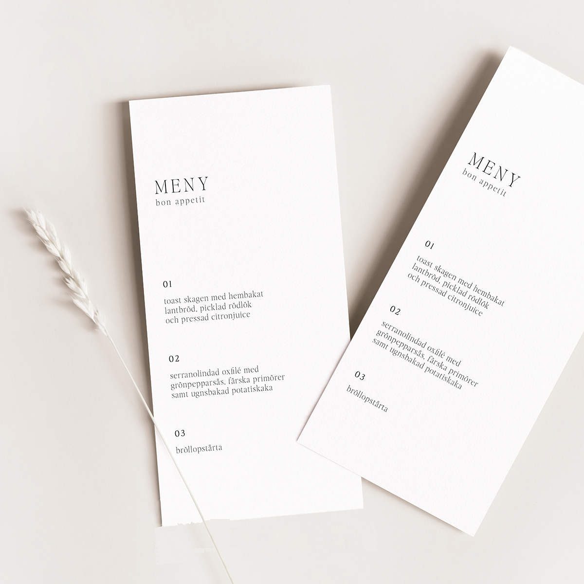 Menykort till bröllop från vår kollektion nr 01. Matcha samtliga trycksaker för ett enhetligt uttryck, se övriga trycksaker som ingår i kollektionen här. Saknar ni någon trycksak så hör av er till oss så hjälper vi givetvis till att ta fram det ni önskar.
