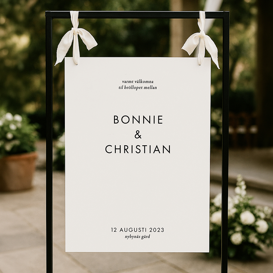 Välkomstskylt till bröllop från vår kollektion nr 08. Matcha samtliga trycksaker för ett enhetligt uttryck, se övriga trycksaker som ingår i kollektionen här. Saknar ni någon trycksak så hör av er till oss så hjälper vi givetvis till att ta fram det ni önskar.