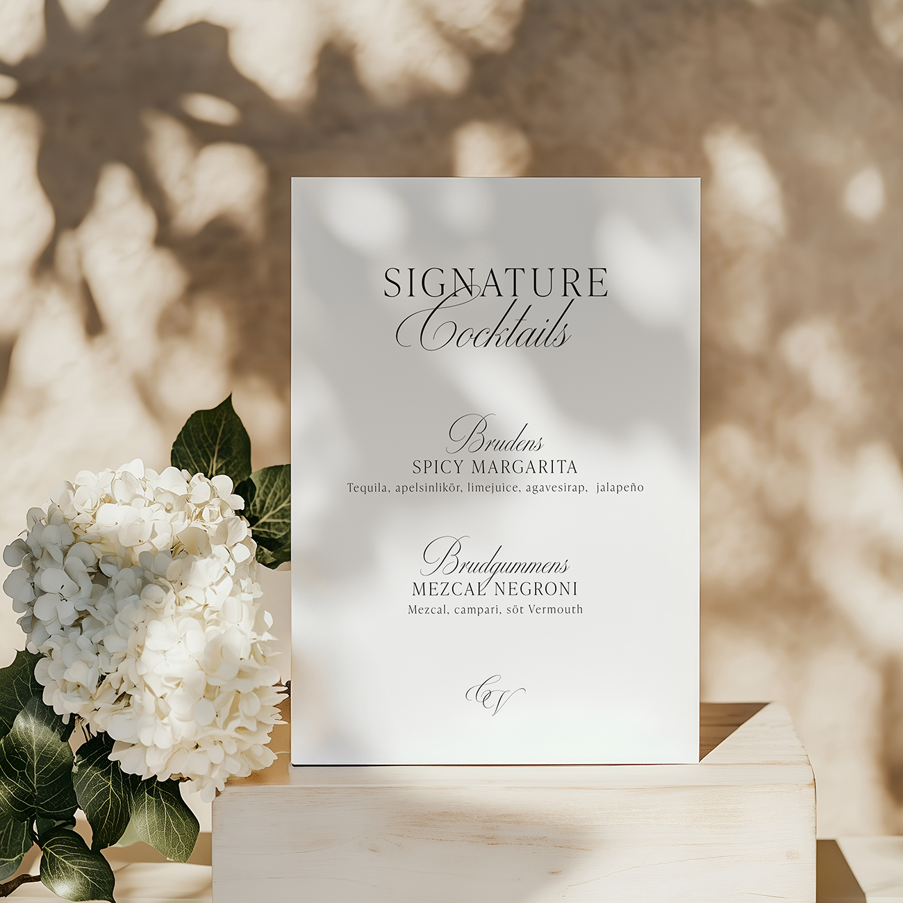 En personlig och stilren detalj med en barmeny för bröllopet där ni presenterar brudparets egna signature cocktails. En snygg och stilren barmeny gör det enkelt för gästerna att se vilka drinkar som serveras samtidigt som den blir en stilfull dekoration.