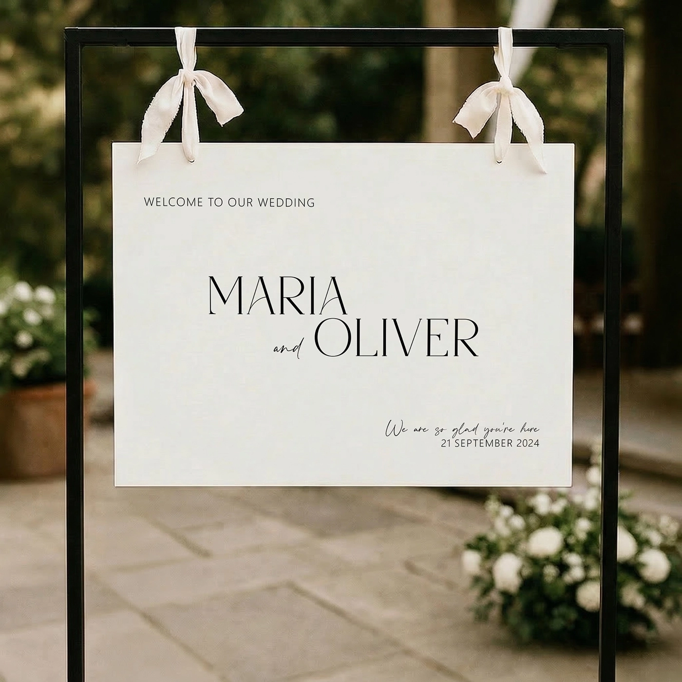 Vår välkomstskylt anpassas med era namn vilket ger en personlig touch och blir ett fint minne från er stora dag.